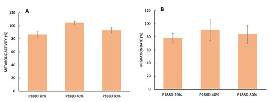As can be seen in Figure 2A,B, the presence of the 20% peptide fraction decreased the metabolic activity and migration rate of the keratinocytes, although it did not reach statistical significance. On the other hand, fractions 40 and 80% do not seem to have any effect on either mechanism. As these fractions did not induce significant changes in the keratinocyte proliferation and migration rate, an additional fractionation was performed, where peptides were separated according to their molecular weight, ranging from 9090 to 401 Da for the 20% fraction (P188D 20%) and from 8082 to 382 Da for the 40% fraction (P188D 40%) (Table 1). Once again, the keratinocyte proliferation and migration rate were determined in contact with these new peptide fractions.