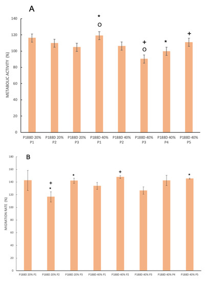 All the peptide sub-fractions induced an increase in the keratinocyte migration rate (Figure 3B), with significant differences. P188D 20%, P2 and P3 are significantly different, with the latter presenting a higher migration rate in comparison to the former. A similar result was observed for P188D 40% P2, wherein P188D 20% P2 and P188D 40% P2 are significantly different, with the latter inducing a higher migration rate. P188D 40 % P3 also significantly affects migration in comparison with P188D 20% P1 and P188D 20 % P3. It seems that the presence of these peptides has a more significant effect on the migratory ability of these cells than on their metabolic activity. In this case, the use of fractioned peptides is very important for skin reepithelization and therefore for the treatment of chronic wounds.