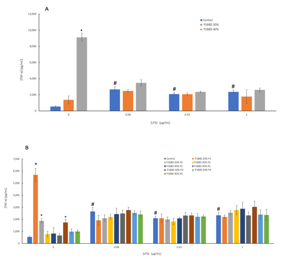TNF-α release in the presence of the different fractions of the peptide (A) 20% and 40% fraction and (B) 20% P1, P2, P3 and 40% P1, P2 and P3, P4, P5 in the presence of different concentrations of LPS. * shows statistical difference in comparison to the control and + shows statistical difference in comparison to all other conditions. # shows statistical difference in comparison to the control of 0 mg/mL LPS (p < 0.05). The error bars represent the standard error.