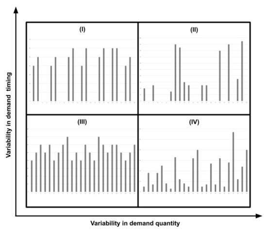 12] complemented this view of demand introducing the coefficient of variation (CV). Both concepts allow us to divide demand types into quadrants, classifying them as intermittent, lumpy, smooth, and erratic demands (see