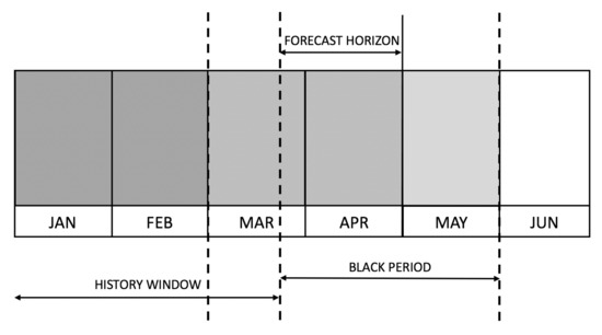 Relevant points in time we considered for forecasting purposes. There is a six-week slot between the moment we issue the forecast and the month we predict. The day of the month considered issuing the prediction is fixed.