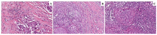 In regard to the correlation between TILs and tumor response to neoadjuvant chemotherapy, our series included only six cases of locally advanced HER-2 positive BC, preoperatively treated with a combination of anthracyclines, taxanes and trastuzumab. All cases examined showed low TILs and none of them underwent tumor pathological complete response (pCR). In addition, 1/6 cases exhibited local disease progression. From an immunohistochemical point of view, in two patients, the neoplasms were luminal HER2 (HR+/HER2+) BCs; in four patients, the neoplasms were pure HER2 (HR-/HER2+, one of which also exhibited immunopositivity for basal CKs—CK14, CK5/6 and focally for CK17, as a basal HER2: HR-/HER2+/basal CKs+).
