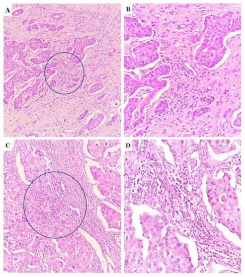 In recent years, the immunogenicity of breast cancer has become subject of great scientific attention, with the aim of better understanding whether it can influence the biological behavior of BC, acquiring prognostic and/or predictive significance of therapeutic response [9,12,14,15,16]. The presence of TILs is an expression of the antitumor immune response. Many studies have therefore focused on the predictive and/or prognostic impact of TILs in patients with different types of cancers, including BC [9,10,11]. TILs are classified into stromal and intratumoral TILs, depending on whether we consider the lymphocytes dispersed in the tumor stroma, or the lymphocytes located within the tumor nests [9,14,15]. Due to the absence of a standardized method for evaluating TILs, many studies have evaluated both the sTILs and the iTILs; however, the evaluation of the former was easier to detect and more reproducible [9,14,15,16]. In 2014 a series of recommendations for a standardized assessment of TILs in breast cancer was proposed by an international TILs working group [14]; in addition, several studies demonstrated the prognostic and predictive value of TILs in various cohorts of patients; particularly, among triple negative BCs (TNBCs), TILs can be used as a prognostic marker because they positively correlated with the response to adjuvant chemotherapy, in terms of overall survival [9,12,16,17,18]. Recent studies aimed to investigate the potential prognostic role of TILs in patients affected by HER-2 positive BC treated with chemotherapy plus trastuzumab. In this regard, the FIN-HER study [18] demonstrated that patients affected by BC exhibiting high TILs levels showed a better response to adjuvant chemotherapy with trastuzumab and, consequently, longer overall survival than those affected by BC showing low TILs. On the other hand, Perez et al. [19] reported that HER2-positive lymphocytic-dominant BCs, defined by the presence of at least 60% sTILs, had a slightly worse response when combining trastuzumab with chemotherapy than those treated with chemotherapy alone in terms of relapse-free survival times (80% and 90.9% at 10 years, respectively). Therefore, based on these data, the potential role of TILs in mediating the response to adjuvant chemotherapy plus trastuzumab still remains controversial. Further data from neoadjuvant therapy-based studies [20,21] showed that high rates of TILs were significantly associated with higher rates of pCR; accordingly, TILs appeared as predictive biomarkers of positive response/resistance to neoadjuvant chemotherapy. Post-neoadjuvant treatment TILs have also been found to be associated with breast cancer prognosis [22,23].