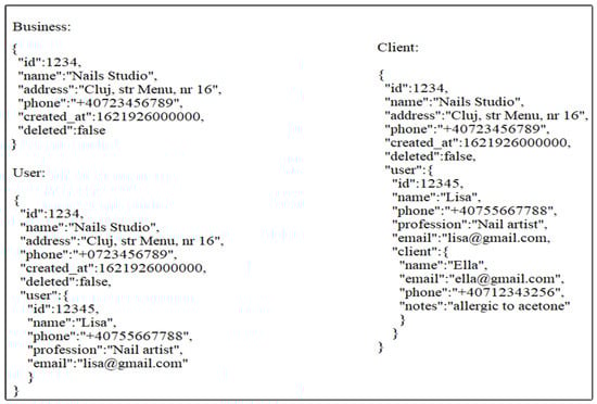 Each document can contain the information of a single customer, which also includes the information of the user to whom it belongs as well as the information of the business to which the user belongs. In this way, each document is independent, although the information is duplicated and takes up more storage space. In the case of this type of database, the structure can be dynamic, new fields can be added, and existing fields can be deleted without affecting the other documents in any way. To keep a structure as close as possible to that of relational-based MySQL, we used objects inside which we defined all the fields presented in Figure 1, except for the deleted and created_at fields that were defined per document, only in the business object.
