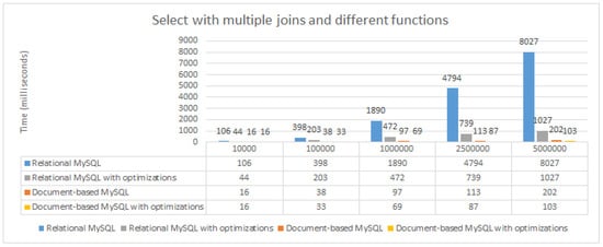 The optimization methods improved the performance for both databases, but as can be seen from Figure 10, they have a much greater impact on relational MySQL. Document-based MySQL has a better performance both before and after optimizations compared to relational MySQL in the case of the select operation using two joins.