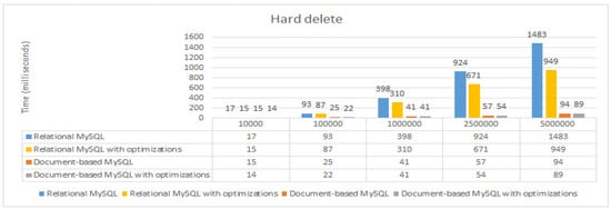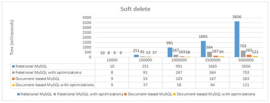For the soft delete operation, the optimization also brings an important impact on relational MySQL, reducing the execution times, but in the case of the hard delete operation, the impact is much lower.