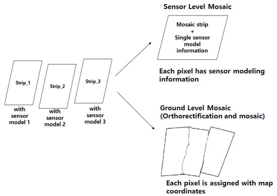 Note that the proposed method is different from the conventional image mosaic carried out with orthorectified images. The proposed sensor-level mosaic is carried out before the photogrammetric processes, including the sensor modeling and orthorectification. Therefore, users can perform their photogrammetric function with the mosaic and the sensor model information.
