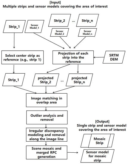 The flowchart of the study is given in Figure 2. Given partially overlapped multiple image strips (n images in the figure) and sensor models covering the area of interest, if one image partially overlapped with other images, it was chosen as the reference image. Each pixel of the other images (collateral images) was first projected to the ground using SRTM DEM and then back-projected onto the reference image space. These projections produce (n − 1) projected images partially overlapped with the reference image. Next, image matching was carried out to extract tie points in the overlap area. A lot of matching outliers should exist because of radiometric and geometric differences, such that it requires detecting and remove them accurately. The discrepancy is expected to show irregular patterns along the image line because of push-broom sensor characteristics. Each line of image has a different position and attitude information. Therefore, we modeled the discrepancy with polynomials after dividing the whole image strip into multiple sub-image regions. Based on the polynomial model, outliers are detected and removed in each sub-image region. This leads to the outlier suppressed tie points set, which enables the irregular discrepancy estimation. The mosaicked image strip can be generated after compensating for the image line discrepancy. Finally, single sensor model information for the mosaic image strip is generated.