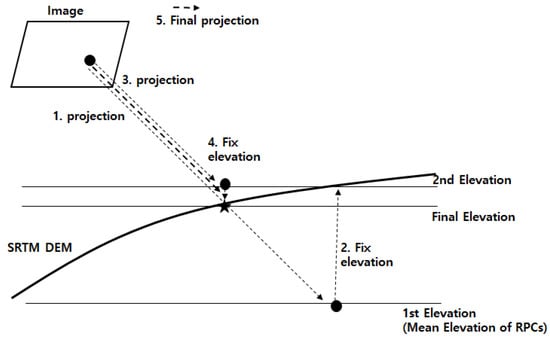 However, the major problem is that the target elevation must be given, and there is no closed solution for the ground elevation computation. Figure 3 depicts the iterative ground elevation search process is depicted. Given an image point, the first image to ground projection is performed to the reference elevation, such as the mean elevation of RPCs. The computed horizontal coordinates are used to look up the ground elevation in SRTM DEM. Next, the second image to ground projection is tried for the estimated ground elevation. This iterative process continues until the no changes in the computed horizontal coordinates.
