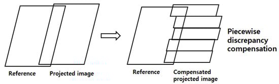 After removing the matching outliers, we can estimate the discrepancy compensation of the projected image by averaging the image coordinates differences between the matching pairs. However, the discrepancy varies for each image line. As shown in Figure 7, averaging single image line discrepancies may produce inaccurate compensation values because there are no redundant matching pairs in an image line. Therefore, we estimated the local discrepancy compensation in the line and sample directions by averaging discrepancies in a block of image lines such as 500 image lines. In addition, we interpolated the averaged differences using a spline curve along the image line to ensure the continuity between compensated image blocks.