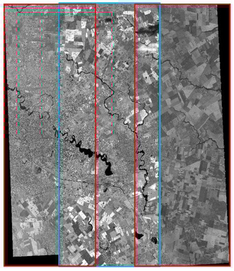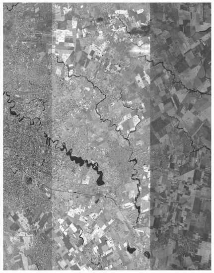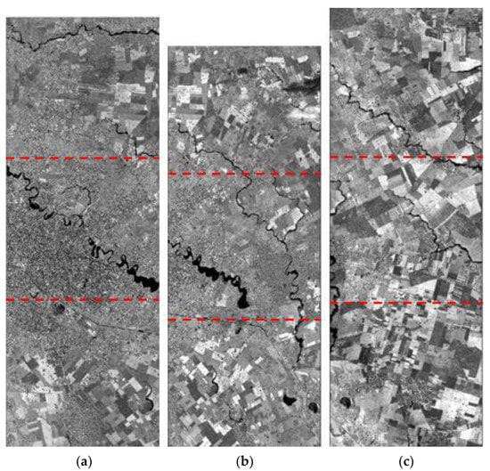 As a trade-off for the low altitude and long focal lengths, the high-resolution satellite data show a relatively narrow field of view compared to the mid- or low-resolution satellite data. WorldView-3, Pleiades-HR, and KOMPSAT-3, for example, have swath widths of 13.1, 20, and 16.8 km, respectively. Note that mid-/low-resolution satellite data have dozens or hundreds of kilometers of swath width. These high-resolution satellite cameras frequently use a combination of shorter CCD (Charge-Coupled Device) lines with a slight overlap to increase the swath width [2,3,4,5,6]. As examples, IKONOS, Quickbird, KOMPSAT-3 have three, six, and two overlapping PAN CCD lines, respectively, with shifts in the CCD lines in the scan direction. The merge of each sub-scene from CCD lines is carried out with precise camera calibration information. Each sub-scene is processed considering the sensor alignment, ephemeris effects, and terrain elevations to be merged for a single scene covering a larger swath [2,5].