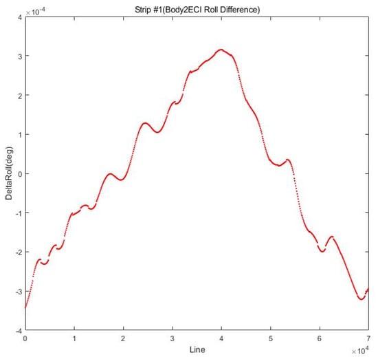 Figure 6 depicts the interpolation residuals for the roll angles of Strip #1, demonstrating that the original roll angle varies locally along the image line. The conversion residuals from the physical model into RPCs are presented in Table 2 for two cases using the original ephemeris and the interpolated ephemeris. Using the interpolated ephemeris shows residuals that are a little better than the other case, which is affected by the local variation in the ephemeris. In Strip #1, the residual in the sample direction improved by more than one pixel.