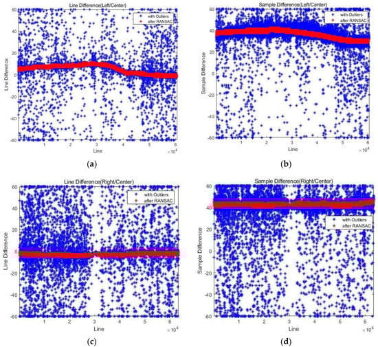 We applied the RANSAC algorithm with second polynomial models for each line and sample coordinate differences to suppress the matching outliers. The polynomial model was applied to each scene in an image strip. The red dots show the results after the outlier removal.