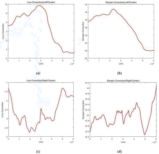 Figure 9 shows the estimated local discrepancy for the line and sample directions for every 500 image lines after the spline interpolation. In other words, the red line was derived by averaging the red dots in Figure 8 for every 500 image lines and interpolating them in the spline curve. Figure 9a,b shows the line and sample compensations for Strip #1, and Figure 9c,d are for Strip #3. The rewards for sample coordinates ranging from 30 to 44 pixels are much larger than those for line coordinates.