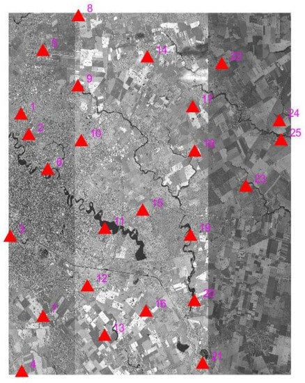 To check the accuracy of the generated RPCs, we collected 25 GCPs over the mosaic strip from Google Earth, as shown in Figure 12. We used Google Earth Pro to extract the horizontal and vertical coordinates. Though the accuracy of Google Earth may differ depending on the areas, a few meters of positional accuracy was reported over near urban areas in Europe [18]. First, using the 25 GCPs as checkpoints, we estimated the accuracy of the aforementioned two RPCs of the center strip and mosaic strip, as shown in Table 3. RPCs of the center strip showed rather low positional accuracy of 4.02 and 40.07 pixels in RMSE for the line and sample directions, respectively. However, the RPCs of the mosaic showed much better results reported as 2.88 and 21.07 pixels in RMSE for line and sample directions. The accuracy improvement ranged from 18% to 47.4%. The geolocation performance of the resulted mosaic RPCs seemed improved due to the averaging effects of all RPCs of input data. The RPCs of the mosaic should be more accurate than the RPCs of each strip if more image strips are used for the mosaic.