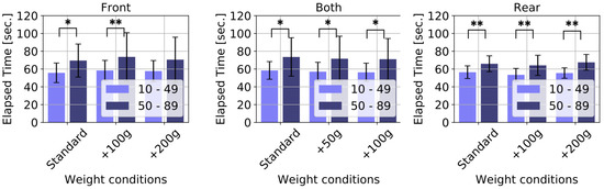 For each scale, we conducted a three-factor mixed ANOVA on age, gender, and weight condition and identified significant age-related trends in each case. The elderly group took longer to complete the game than the young group for most conditions (front: F(1,198) = 34.366, p = 0.000, both:F(1,168) 7.845, p = 0.006, rear:F(1,174) = 48.658, p = 0.000). In contrast, our analyses of the weight condition and gender factors did not reveal notable trends.