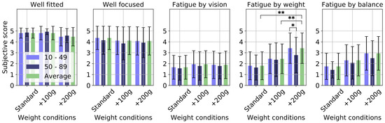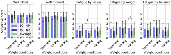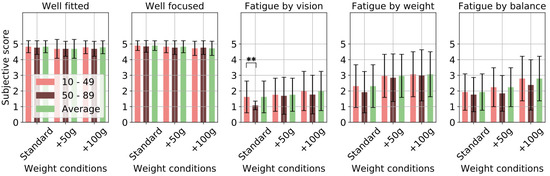 However, some participants reported visual fatigue, and these reports were reasonably consistent across the various weight conditions and locations investigated in the experiment. The results show that, at least for short-term use, weight and balance do not affect visual fatigue. Reports of fatigue were more common among the elderly participants, which likely reflects their lack of familiarity with playing VR games. Similarly, elderly participants took longer to complete the game.