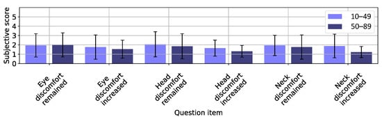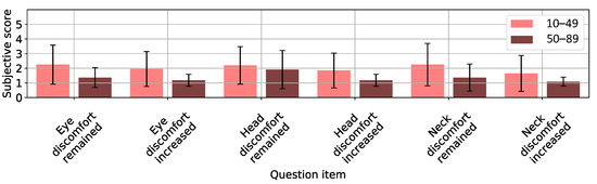 Figure 10 and Figure 11 show the results of the questionnaire answered 15 min after game completion for all three weight-location groups. On average, the participants scored the residual effects felt by the eyes, head, and neck as 2 (i.e., slightly disagree), thereby indicating insignificant residual effects.