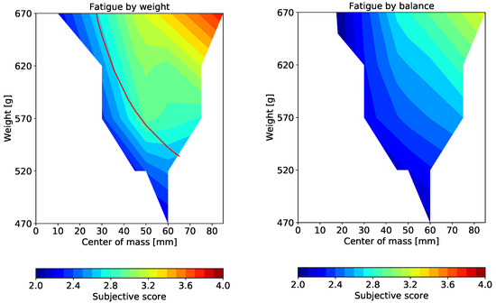 Figure 12 shows the mean fatigue score as an isosurface in two-dimensional space comprised by the weight and balance axes. The value on the vertical axis is larger as the weight increases, and on the horizontal axis is larger as the center of mass moves forward from the tragion notch. Several points determined from the experimental conditions are plotted, and the larger the fatigue score, the redder the color. These points were then linearly interpolated to form a contour plot. The blank areas were not included in the experimental conditions. The weight and the COM conditions are listed in Table 1. The results show that, even when the added weight was unchanged, the fatigue score increased as the COM shifted toward the front of the head. In addition, even if the COM was unchanged, the fatigue score increased with the weight.