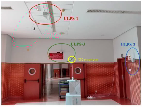 General view of the 3D scenario considered with three ULPS units installed on three perpendicular planes of the environment and a mobile receiver.