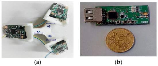 A 3D ultrasonic receiver assembly has also been designed. It is composed of three receivers, RA, RB, and RC, placed in the three faces of a tetrahedron. This distribution has been adapted to capture ultrasonic transmissions coming from as many directions as possible. All three receivers are wire-synchronized, whereas the general aspect of this 3D ultrasonic receiver is shown in Figure 3a. Three buffers (SD memory) have been added to each receiver to store the acquired signals, where receiver RA is the master and receivers RB and RC are slaves.