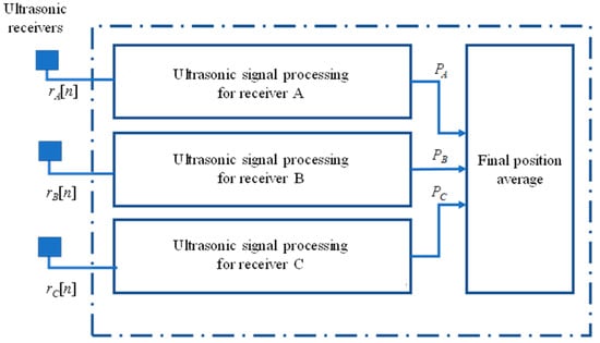 In this context, ultrasonic positioning systems have been considered as an interesting technology for indoor applications, mainly due to certain advantages, such as suitable accuracy, low power and low cost [3,4]. Thus, some 3D ultrasonic positioning systems have been developed using diverse configurations, as reviewed in [5,6]. They are based on two main approaches: emitters are located at fixed positions while receivers are moving in the environment, and vice-versa. They are often based on trilateration or multi-lateration [3,7,8,9,10], consisting of the determination of times of arrival (TOA) [5] or time differences of arrival (TDOA) [3]; however, it is also possible to find other options, such as those based on angles of arrival (AOA) [9], or hybrid techniques [10]. In certain cases, the availability of multiple position estimates also involves applying a merging technique to obtain a final position [6,10,11].