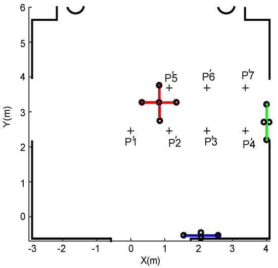 Workspace configuration and grid of positions considered to evaluate the positioning performance. ULPS-1 is plotted in red, ULPS-2 in blue, and ULPS-3 in green.