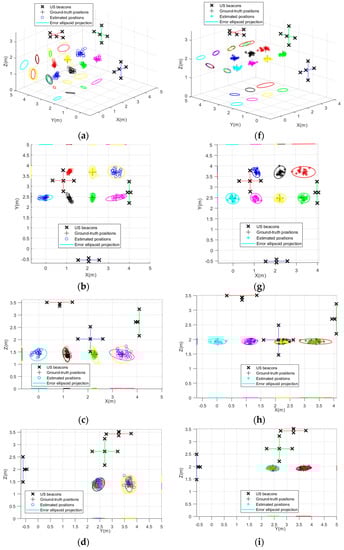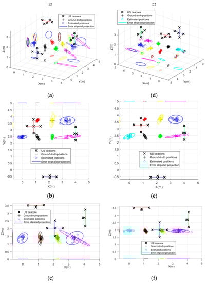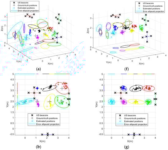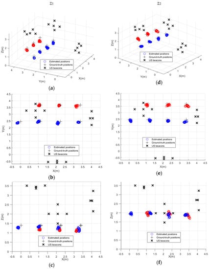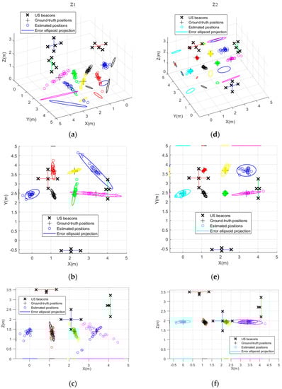 (a–f) Clouds of estimated positions with an EKF and three ULPSs for σw = 0.2 m, at z1 = 1.35 m (left) and z2 = 1.93 m (right): successively, 3D representation of clouds of points; Y–X projections; and Z–X projections.