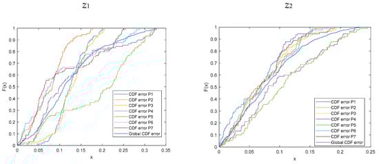 Simulations have been carried out for the seven positions P1–P7 at z1 and z2, with a typical deviation . As before, Figure 10 plots the clouds of positions, which are more concentrated around the ground-truth points, with lower dispersions. The mean errors and the standard deviations are listed in Table 7. Finally, the errors for 90% of the cases for the seven studied points P1–P7 are between 0.107 and 0.3 m at z1, and between 0.105 and 0.2 m at z2, as can be derived from Figure 11.
