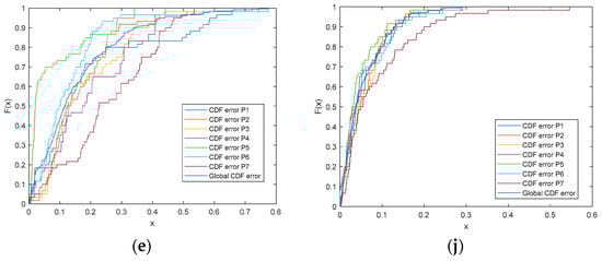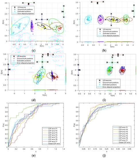 Experimental results for the tested points P1–P7 for both heights, z1 = 1.35 m on the left (a–e) and z2 = 1.93 m on the right (f–j): successively, 3D representation of clouds of points; Y–X projections; Z–X projections; Z–Y projections; and experimental CDFs for each point after AKF fusion.