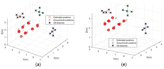 The initial position to apply the EKF is estimated using the Gauss-Newton algorithm with the first set of measurements, and for the rest of the steps the positions will be updated feeding the EKF directly with the raw measurements taken. For a single ULPS, the number of required distance differences is at least four. The EKF is also based on a loop of two steps: prediction (13) and updating (14). This algorithm linearizes the state vector and its covariance matrix, applying several observations [37]. Those observations are computed from the US measurements and presented as the distance differences at instant k, () between the mobile receiver (x, y, z) and the beacons i, (xi, yi, zi), and j, (xj, yj, zj). The distance differences Δdij,k are computed from the TDOAs according to Equations (10) and (11):