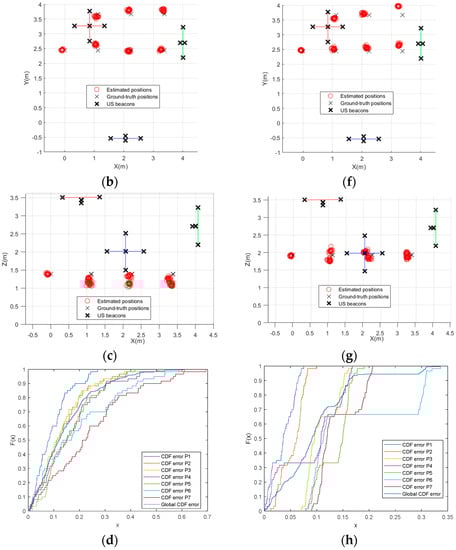 Finally, some results from the EKF applied as a tightly coupled method are presented in Figure 14 with variance in the measurements of distances fixed at σw = 0.2 m. As was confirmed in simulations previously, the clouds of the seven positions were more concentrated around the ground-truth points, with low dispersions as well. The mean errors and standard deviations are listed in Table 12. It is worth mentioning that all the axis errors decreased for both heights, especially for z2, to less than 0.17 m at z1 and less than 0.13 m at z2. The CDF errors for 90% of the cases for the seven studied points were between 0.18 and 0.45 m at z1, and between 0.06 and 0.3 m at z2, as plotted in Figure 14d,h.
