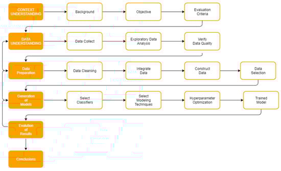 In Data Science, it is essential to define the project flow steps and the methodology to be followed. The method used in this work is the Cross-Industry Standard Process for Data Mining (CRISP-DM) [35] with minor adaptations to the application for the context of this research. Figure 1 shows the flow of the methodology model used and Figure 2 shows the proposed solution to this project.