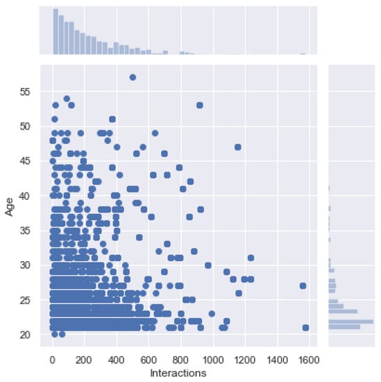 Figure 3 shows the distribution of interactions in VLE by age. A possible observation is that the older the student, the lower their use of the VLE. This may represent an acceptance trend where younger students tend to adhere more to the use of Moodle. Still the right sidebar of the graph shows the distribution of students by age, and the top bar shows the distribution by interactions. As seen, the highest concentration of interactions was found in students between 20 and 25 years of age.