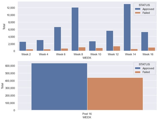 As shown in Table 3, the only case where the distribution was normal was for the Biology course considering all 16 weeks. In this case, the T-Test showed a statistical difference between the means of the two groups. For the other cases, the Mann–Whitney test showed statistical differences between the medians of the two groups. These results allowed us to conclude that the students’ usage of VLE was associated with their subjects’ final status: success or fail.