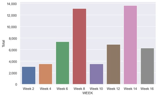Figure 5 shows the distribution of interactions during the weeks of the course. The interactions grew until the partial exams (in weeks 8 and 14/16). This movement is an indication that the closer the exams/tests are in a given subject, the higher the students access to the VLE to consult the materials.
