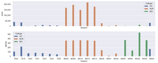 Students’ interactions within VLE in its raw state were collected. These data were separated by students, day of interaction, and type of content. We collected, from the academic system, the subjects enrolled in by each student, the academic performance in the subjects, and the number of previous failures in each subject. The third data’s source was the continuous survey called FormA-Students. This survey is completed by students annually, and it collects 111 attributes distributed in sections referring to socio-demographic and socio-economic background, pre-university and further university studies, employment status, language proficiency, motivation and expectations about career, academic mobility, and scholarships.