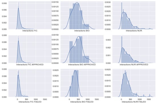 Figure 7 displays the frequencies of the distribution of total interactions by programs and the students’ final status. In FIC and NUR, both categories have their peak of interaction near zero and do not seem to present a different distribution. On the other hand, BIO presents a different distribution of interactions between the categories, with the peak of interactions for the success category near 500 and for the failed category near 300.