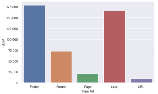 The analysis of the features used in Moodle (Figure 9) showed that Folder, Forum, Page, Quiz, and URL represented around 90% of the students’ environment interactions. From these, most were interactions with folders and quizzes.