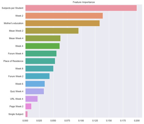 The proposed methodology for combining different data sources, as well as their pre-processing and feature engineering, demonstrated that the combination of data had a high predictive power. In this regard, the combination of the survey variables, academic system, and virtual environment showed a high capacity for early prediction. Thus, it was possible to achieve prediction rates with outstanding discrimination as soon as in the fourth week of the course. This characteristic satisfies the temporal factor of precocity, which is considered to be a determining factor in identifying and attempting to reverse the problem [31,50].