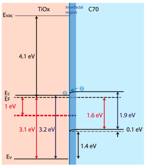 C70/titania band diagrams derived from the photoemission spectra, with energy gaps based on optical absorption data. Reproduced with permission from [178], copyright © 2021, American Chemical Society.