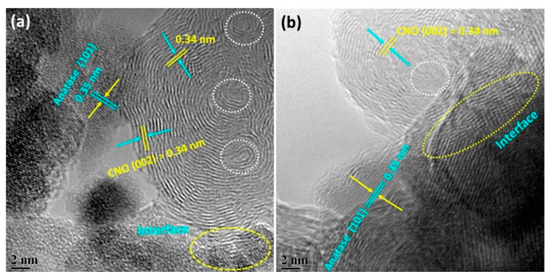HR-TEM images of carbon nano-onion/anatase nanocrystals with different ratios of the two components, consisting of either (a) 89 wt%/11 wt% or (b) 83 wt%/17 wt%, respectively. White-dotted circles highlight the nano-onion cores; yellow-dotted circles indicate the interface between the two components. The nano-onion graphitic walls area visible with the typical 0.34 nm-distance, as is the lattice spacing of 0.35 nm, corresponding to the (101) plane of anatase. Reprinted from [97], Copyright © 2017, with permission from Elsevier.