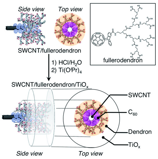 In another work, SWCNTs were first coated with a dendrofullerene (Figure 6) to provide suitable anchoring points for the nucleation and growth of titania while leading to good performance with regard to photo-catalytic H2 evolution under visible-light irradiation. Co-axial inorganic–organic nanowires were thus obtained with a high photo-activity that was rationalized in terms of the electron-extracting TiO2 layer accelerating the electron forward-transfer and the concomitant deceleration of the undesired back-transfer [107].