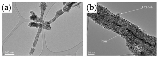 TEM images at lower (a) and higher (b) magnification show MWCNTs coated with titania nanocrystals and partially filled with iron inside for the magnetic separation and recovery of the photocatalyst after use. Reprinted from [184], Copyright © 2018, with permission from Elsevier.