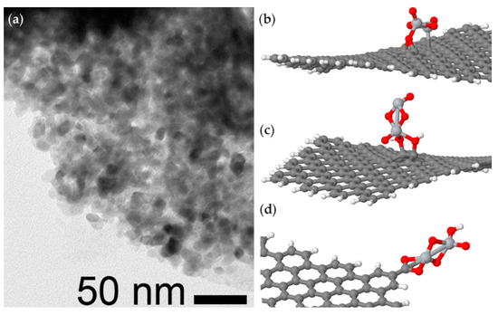 (a) TEM image of a graphene oxide flake covered by anatase titania nanocrystals that are highly homogeneous in size; (b–d) in silico investigation revealed how the nanocarbon’s oxygen-bearing functional groups (i.e., (b) epoxide, (c) hydroxyl, and (d) carboxylic acid) anchored titanium species, thus favoring nucleation over the growth of the nanocrystals. Adapted by permission from Springer Nature [101], copyright © 2020.