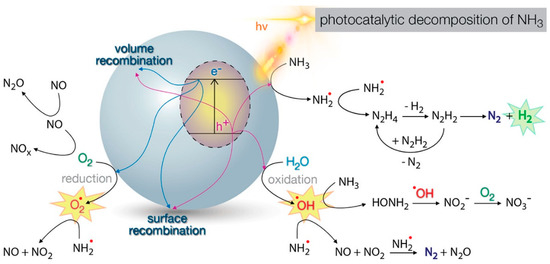 Scheme of the fundamental reaction pathways of ammonia degradation photocatalyzed by titania. Reprinted with permission from [214], Copyright © 2020, American Chemical Society.