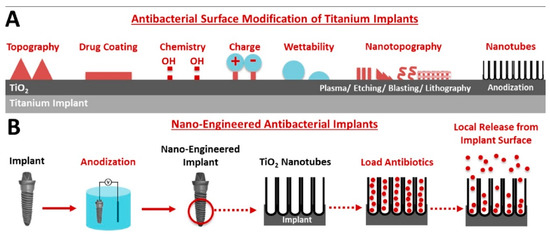 Schematic representation of (A) potential titanium–implant surface modification to attain antibacterial activity, and (B) in particular, the use of electrochemically anodized titania nanotube arrays for the local release of antibiotics. Reprinted from [223], Copyright © 2021, with permission from Elsevier.