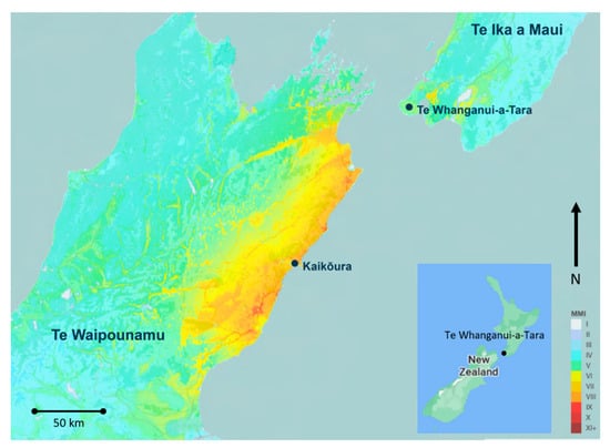 Location of the 2016 Kaikōura Earthquake in Aotearoa New Zealand by using ShakeMap data (Modified Mercalli Intensity (MMI) data) to show levels of shaking for different locations [28].