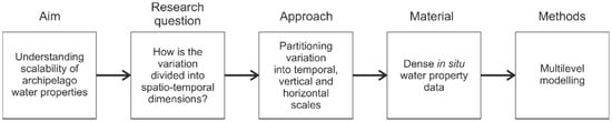This study aimed at statistically examining the scalability of water properties in space and time in a heterogeneous archipelago (Figure 1). More specifically, we examined how the variation in archipelago water properties is divided into the temporal, vertical and horizontal dimensions (Figure 1). We pursued this by statistically reanalysing a unique, pre-existing dataset from the SW Finnish archipelago (described in Suominen et al. []). This dataset included four water property variables: temperature, salinity, pH and chlorophyll-a concentration. The measurements were repeated densely at local (102 m or hundreds of metres) and regional (104 m or tens of kilometres) scales, along the vertical gradient (topmost 10 m) and in time (three-week intervals) during one growing season (May–October). We partitioned the variation in water properties to temporal, vertical and spatial dimensions utilising multilevel modelling, to gain better understanding of the scalability of the in situ measurements of different water parameters on the archipelago coast (Figure 1).
