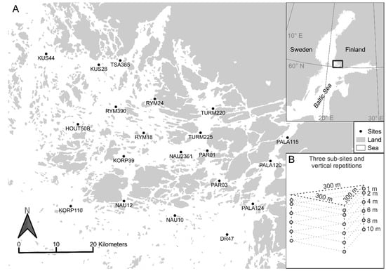 (A) The 20 sampling sites in the SW Finnish archipelago in 2007. (B) Sub-site sampling pattern with three parallel depth profiles at one sampling site (redrawn and modified from []).